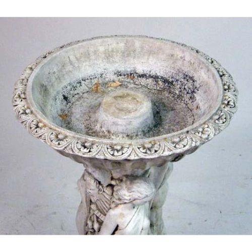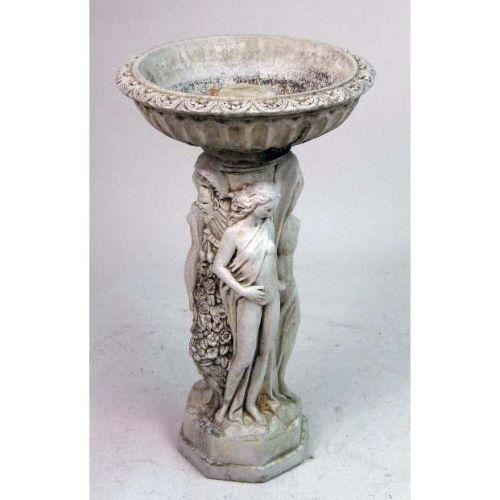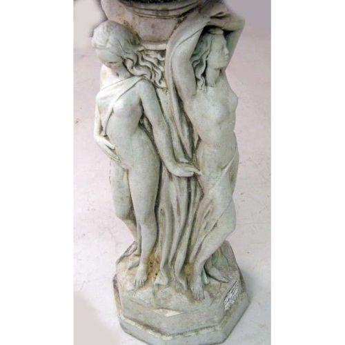 A CLASSICAL-STYLE CAST BIRDBATH<BR><BR>Depicting the Three Graces. Shrinkage cracks to basin and pedestal, 35"h x 19-1/2"dia.