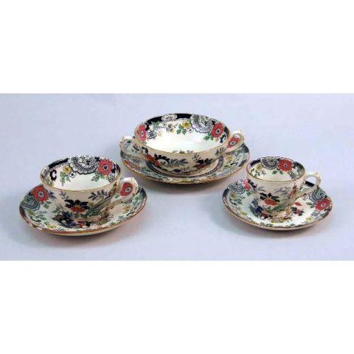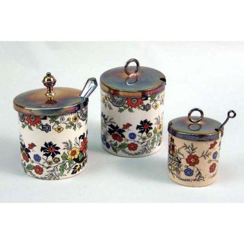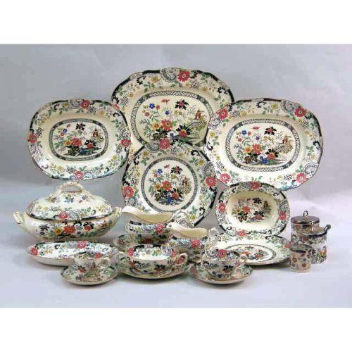 A COALPORT, ENGLAND "CANTON" PATTERN KINGSWARE EXTENSIVE DINNER SERVICE<BR><BR>Polychrome, comprising 10 dinner plates, 12 luncheon plates, 12 dessert plates, 8 salad plates, 8 bread & butter plates, 6 rimmed soup bowls, 6 rimmed cereal bowls, 4 fruit bowls, 11 bouillon plates with 11 underplates, 12 teacups & saucers, 9 demi-tasse cups & saucers, 3 oval graduated platters, 15"long, 13"long & 11"long, 2 oval covered vegetable dishes, 2 gravy boats with attached underplates, 3 open vegetable dishes, 10-1/4"long, 1 open vegetable dish, 9-1/4", 2 open vegetable dishes, 9"long, 2 oval condiment dishes, 1 with repaired crack, coffee pot, teapot, and cream jug, together with 3 mustard jars in a similar pattern, 2 stamped "Sandland Ware", Lancaster & Sandland, Hanley, Staffordshire, England, and 1 stamped Royal Norfolk, Staffordshire, England