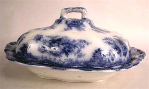 A COBALT DECORATED COVERED SERVING DISH; Marked "Asiatic Pheasants T.H. & Son," the whole decorated with flowers, birds and butterflies (some imperfections to glaze) 5"h x 11"l