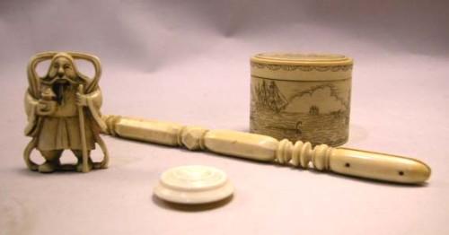 A COLLECTION OF BONE ITEMS COMPRISING: a netsuke, a "button", a scrimshawed covered circular box, and a turned sewing article, 8"l