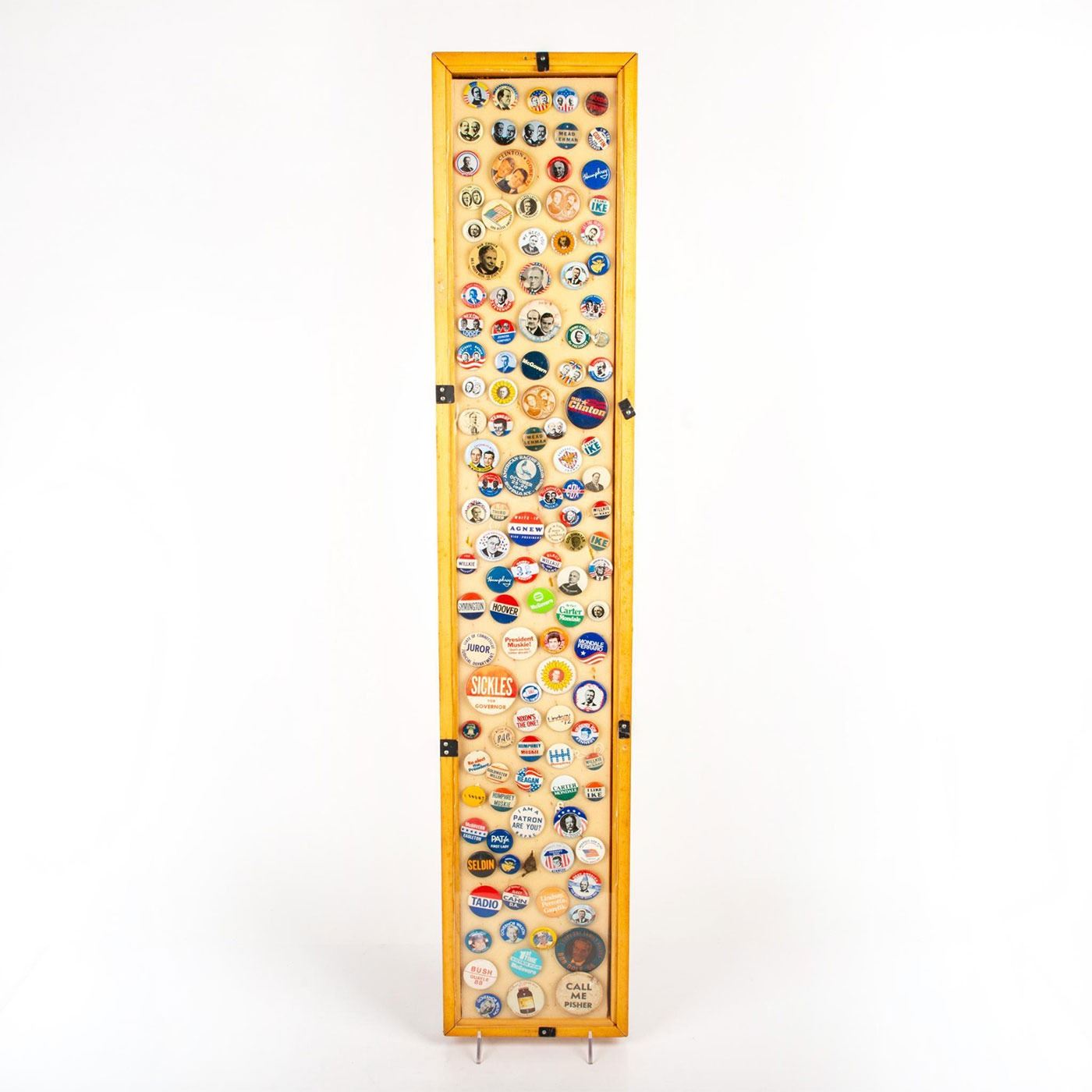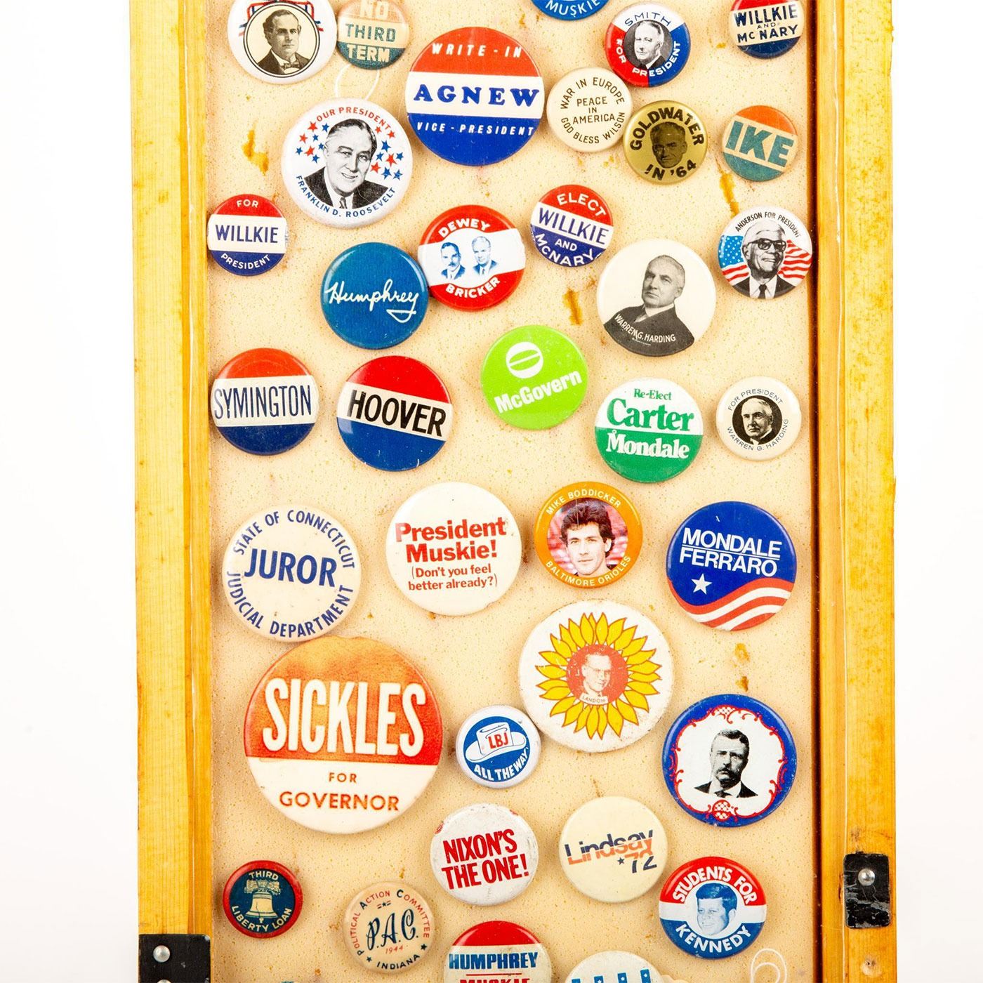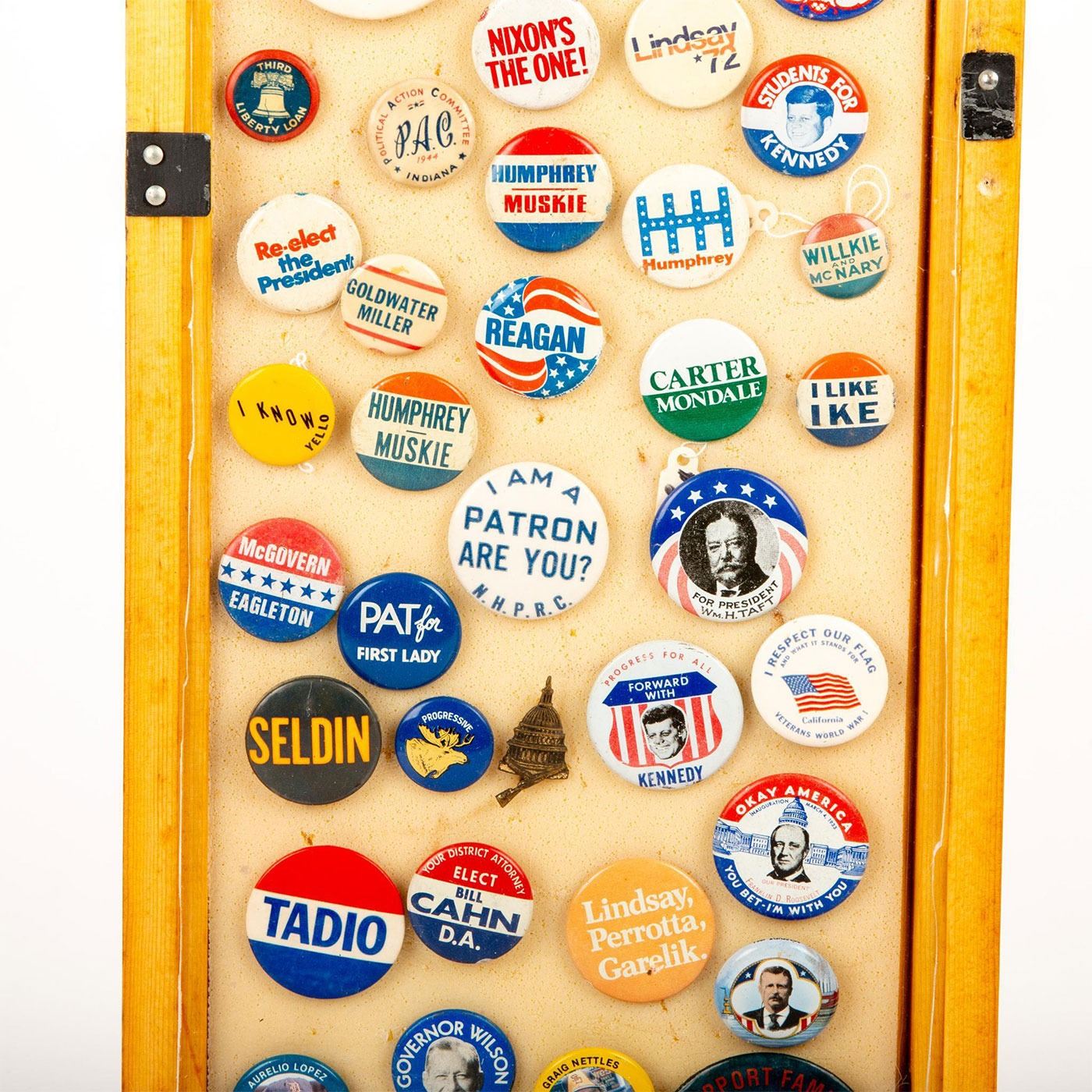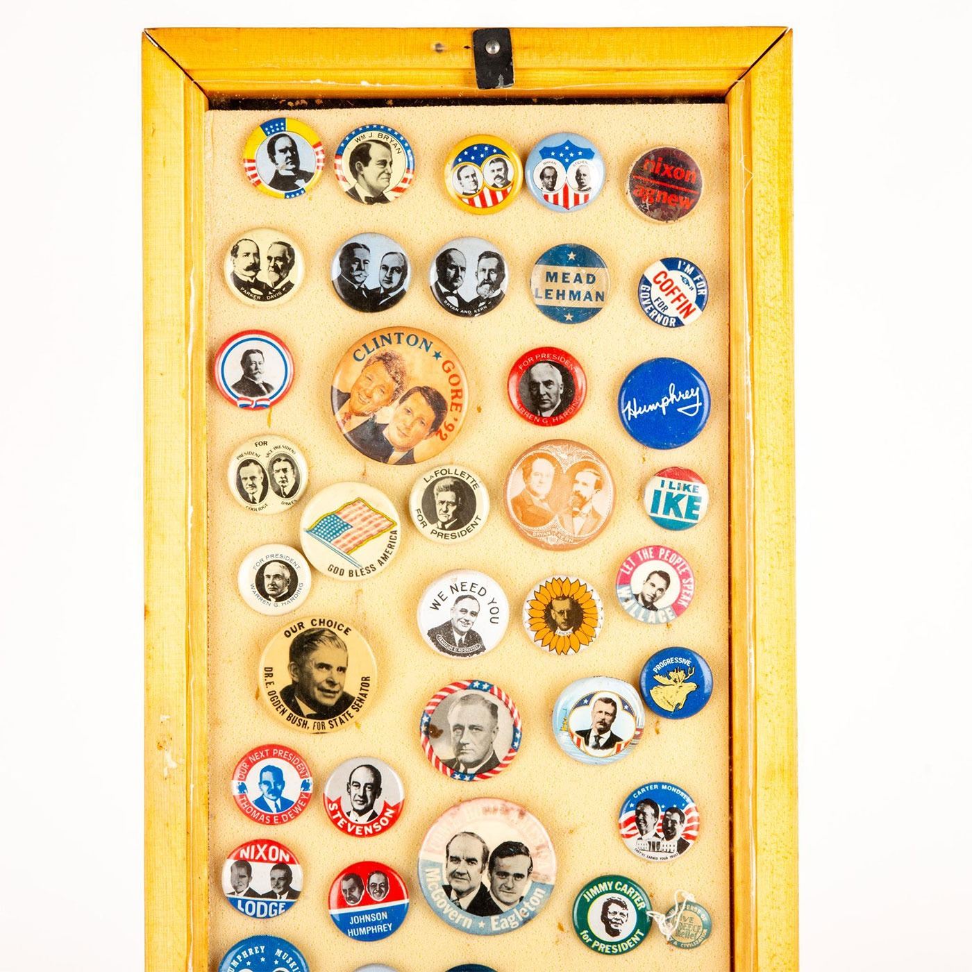 120 Pinback buttons including political and others. In this lot you will find another impressive display in a wood case under plexiglass of mostly political pin back buttons. Included are campaign buttons from Teddy Roosevelt to Ike from Franklin Roosevelt to Clinton and anything in between. This is part of a larger collection found in other lots in this auction so be sure and take a look at the entire collection that was amassed by this collector of many years. Be sure and look closely at all the pictures as there are many rare or hard to find examples. Political Memorabilia
