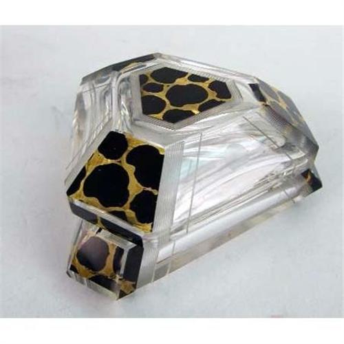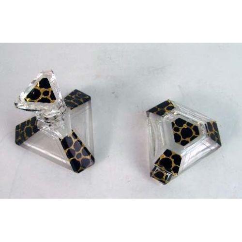 A COLORLESS ETCHED GLASS PERFUME BOTTLE WITH STOPPER<BR><BR>Purchased in Czechoslovakia, Triangular form with leopard print. Together with a similar covered box, wear