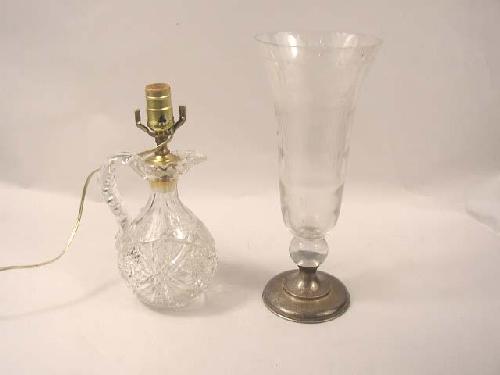 A COLORLESS ETCHED GLASS VASES WITH STERLING SILVER BASE; Hawkes, together with a colorless cut glass pitcher now fitted as a lamp (chips), two pieces, 14 1/2"H.
