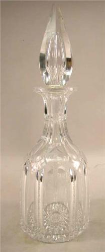 A COLORLESS GLASS DECANTER WITH STOPPER; With faceted tear-form stopped continuing to a faceted form vessel with cut ridges and pattern decorated base 14"h
