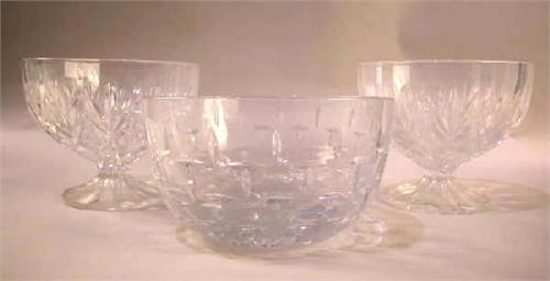 A COLORLESS GLASS RICE PATTERN SERVING BOWL; Together with a pair of colorless glass footed compotes