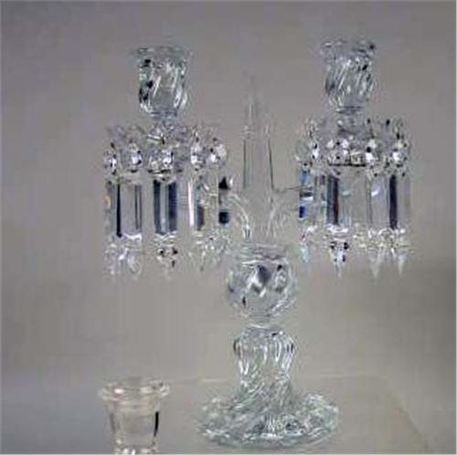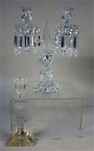 With crystal prisms, marked Baccarat. Together with a rock crystal columnar-form candlestick, 13"h, 2 pieces