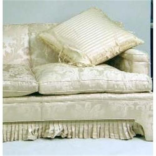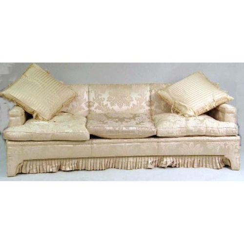 A CONCAVE FRONTED THREE-CUSHION SOFA<BR><BR>Upholstered in cream damask, losses to fabric