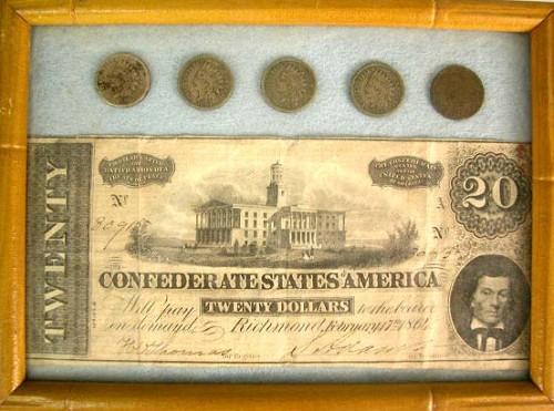 A CONFEDERATE STATES OF AMERICA TWENTY DOLLAR BILL, DATED 1864; Together with a group of five Indian Head Pennies, dated 1861-1865, all framed together