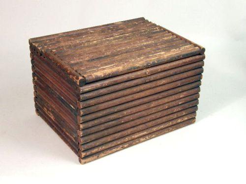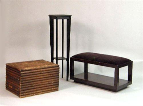 Together with a black pedestal, and a rustic chest. 18"h x 18"w x 36"d, 45 1/2"h x 12"sq., 16 1/2"h x 26"w x 20"d, respectively