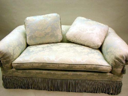 A CONTEMPORARY BLUE AND WHITE SILK UPHOLSTERED LOVESEAT; 5'9"l