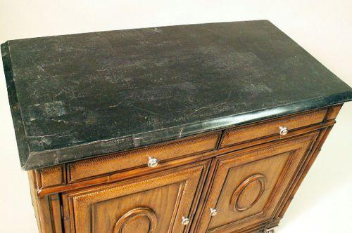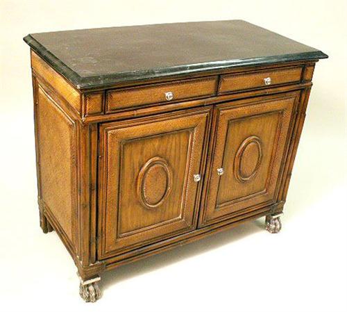 With a faux stone painted rectangular top above drawers and cabinet doors, from the Ernest Hemingway Collection by Thomasville. 30"h x 38"w x 19"d.