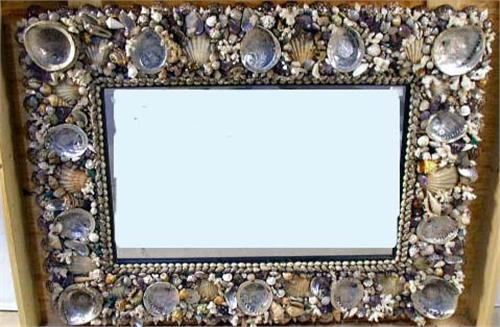 A CONTEMPORARY SHELL-DECORATED LARGE RECTANGULAR MIRROR; 4'2"h x 38"w
