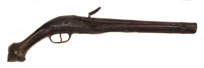 With carved hardwood stock and brass furniture.Latter 18th century. Cock lacking. Worn.Overall length 48.1 cm.