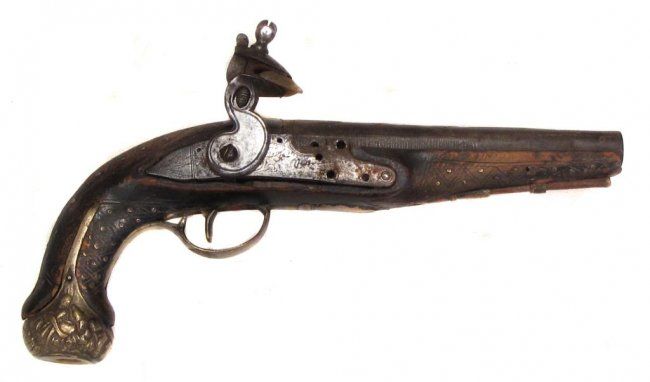 With engraved lockplate, the hardwood stock incised and set with brass studs, brass mounts. Fine imported damascus twist barrel. Early 19th century. Lacking pan, frizzen, frizzen spring and pommel button. Some wear. Overall length 29.5 cm.