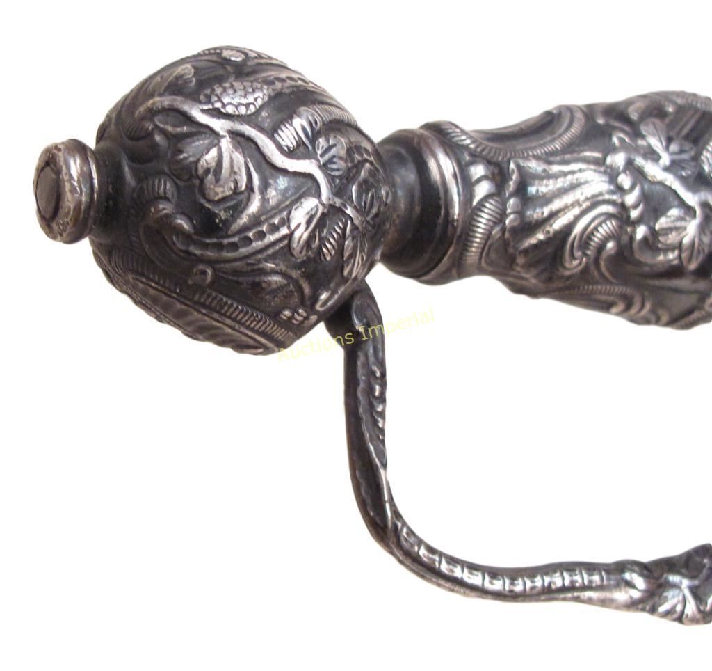 Likely German, with superbly embellished silver hilt, comprising double-clamshell guard, grip, knucklebow and pommel, decorated en suite in embossed and engraved baroque vinework motifs. The long, straight, double-edged blade of flattened-hexagonal section, the lenticular forte etched with a radiant sun within an eight-pointed star, implying a Masonic association. Mid-18th century. Guard slightly loose, light age darkening to blade. Overall length 95.1 cm