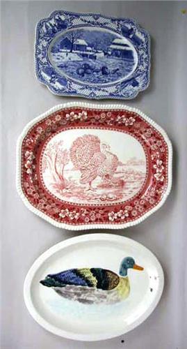A COPELAND SPODE RED AND WHITE TRANSFERWARE "TURKEY" PLATTER; with gadrooned border, 23"l, TOGETHER WITH a blue and white "Thanksgiving Day" platter, 17 1/2"l, and a modern oval mallard drake platter, 21 1/2"l