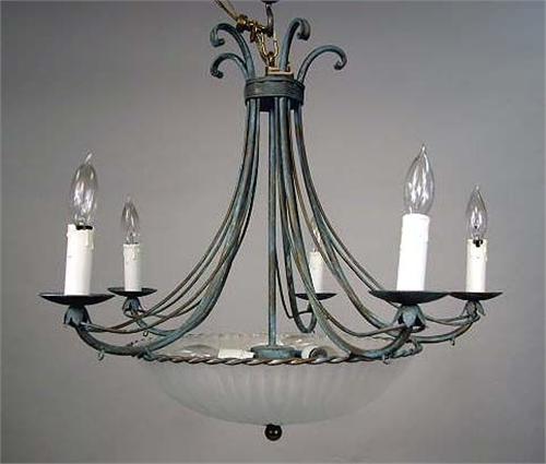 A COPPER PATINATED METAL EIGHT LIGHT CHANDELIER; With downswept arms and a ribbed glass base, electrified