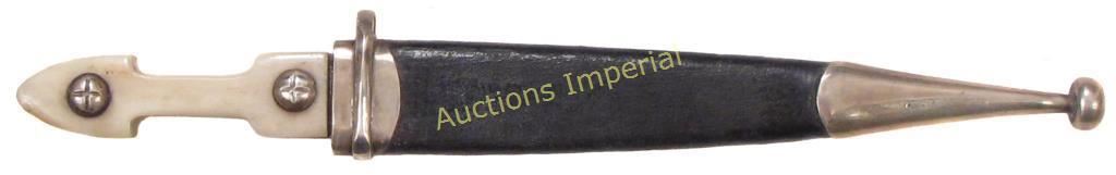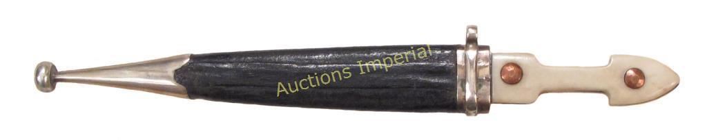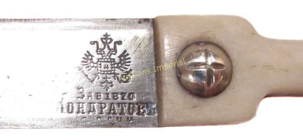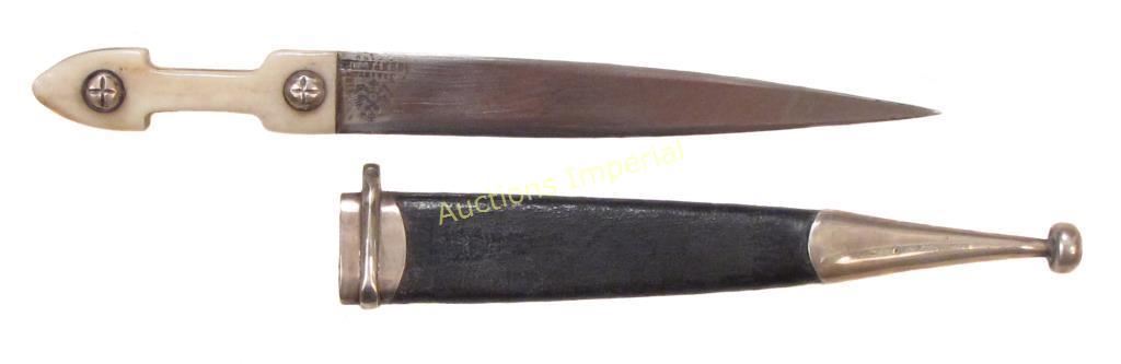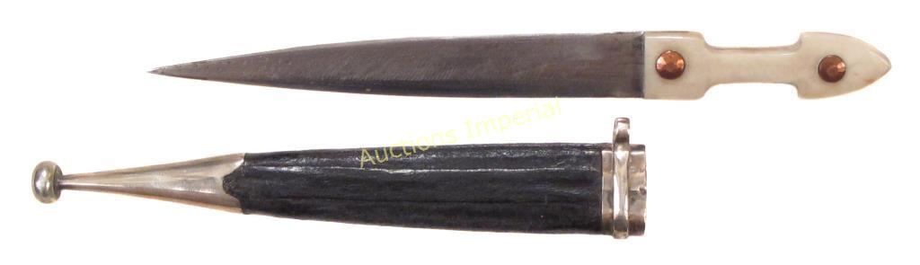 The polished bone grips with domed bosses, the straight, double-edged blade struck at the forte: KONDRATOV 1870 together with the Imperial Russian double-headed eagle. In its leather-covered wooden scabbard with polished steel mounts. Second half of the 19th century. Made by a highly-regarded Imperial Russian arms maker. Very light wear. Overall length 18.5 cm.