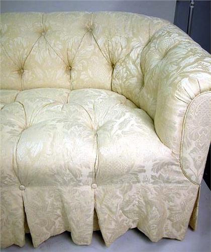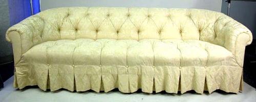 A COUCH Ivory colored upholstery with matching pillows, some wear, 8'1"l