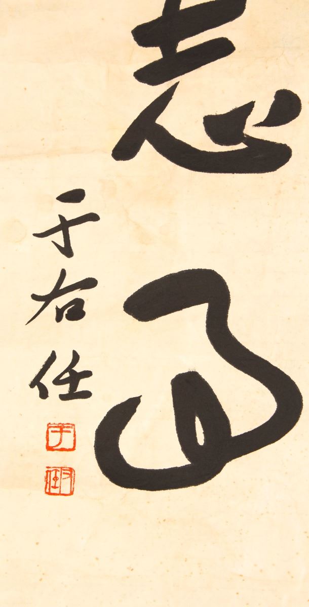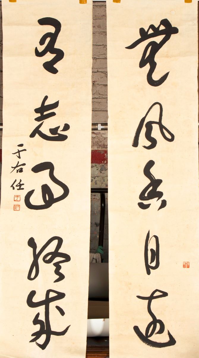 A couplet of calligraphy painting, black ink on paper, attributed to Yu Youren, followed two red seals on a paper and one on the other. Length 53.5" Width 13.75"