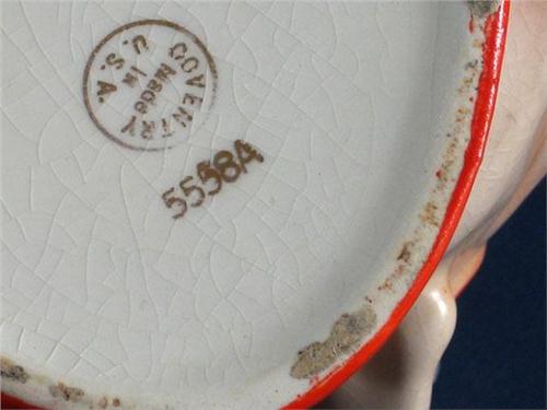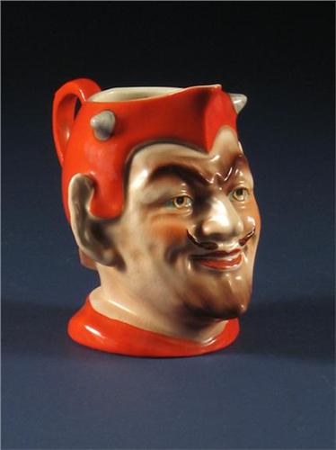 PORCELAIN: A figural porcelain creamer in the form of a devil's head, halmarked ''Coventry USA, 5558A'', polychrome molded facial features, orange clothing, 5'' x 4'', slight crazing, interior black spots (ink marks), no chips or cracks noted.