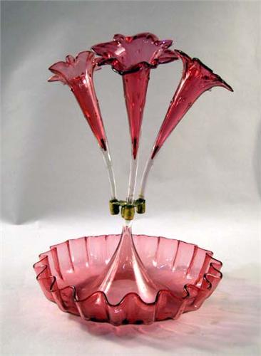 A CRANBERRY FLORAL BUD VASE; With three removable flutes above a ruffled base, 13 1/2" h x 10 1/2" dia.