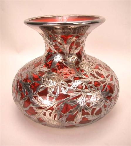 A CRANBERRY STERLING SILVER OVERLAY BALLASTER-FORM VASE; Gorham-Alvin Silver Co., R 3363, 7 1/2"h