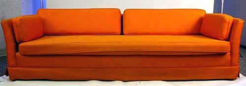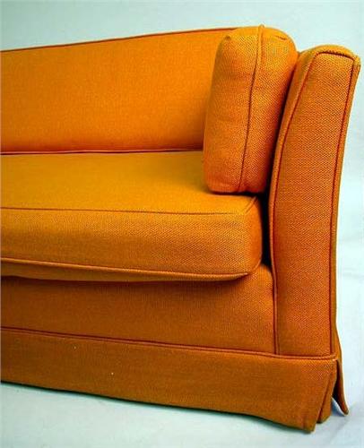 A CUSTOM MADE TANGERINE COLOR UPHOLSTERED SOFA Worn condition, 8'4"l