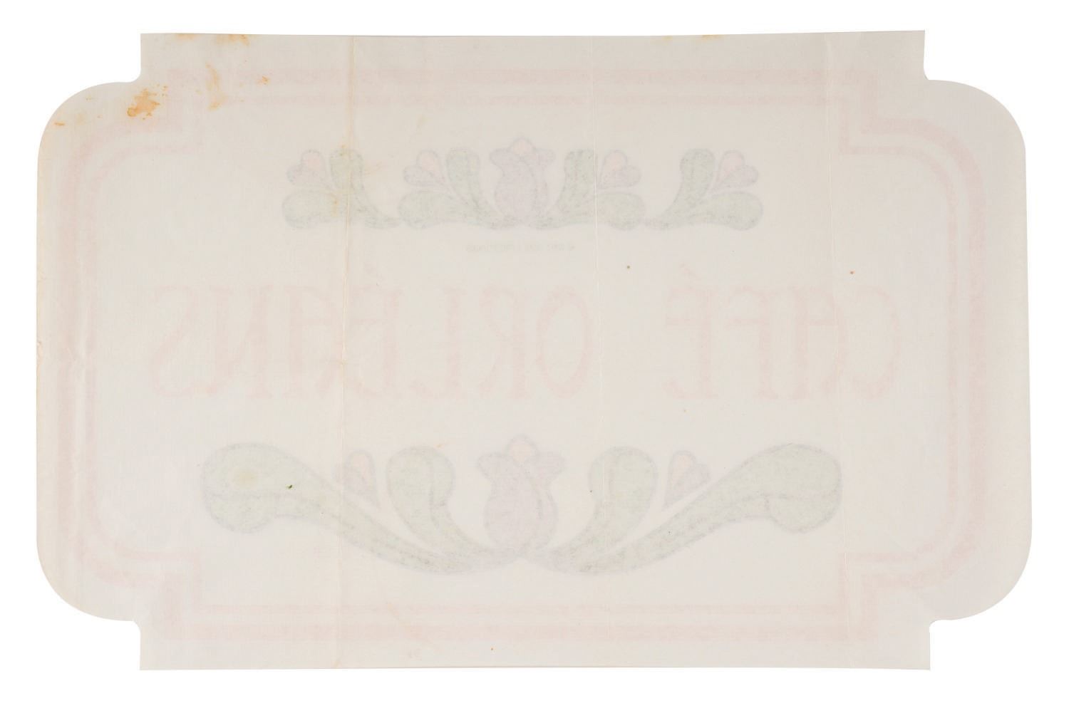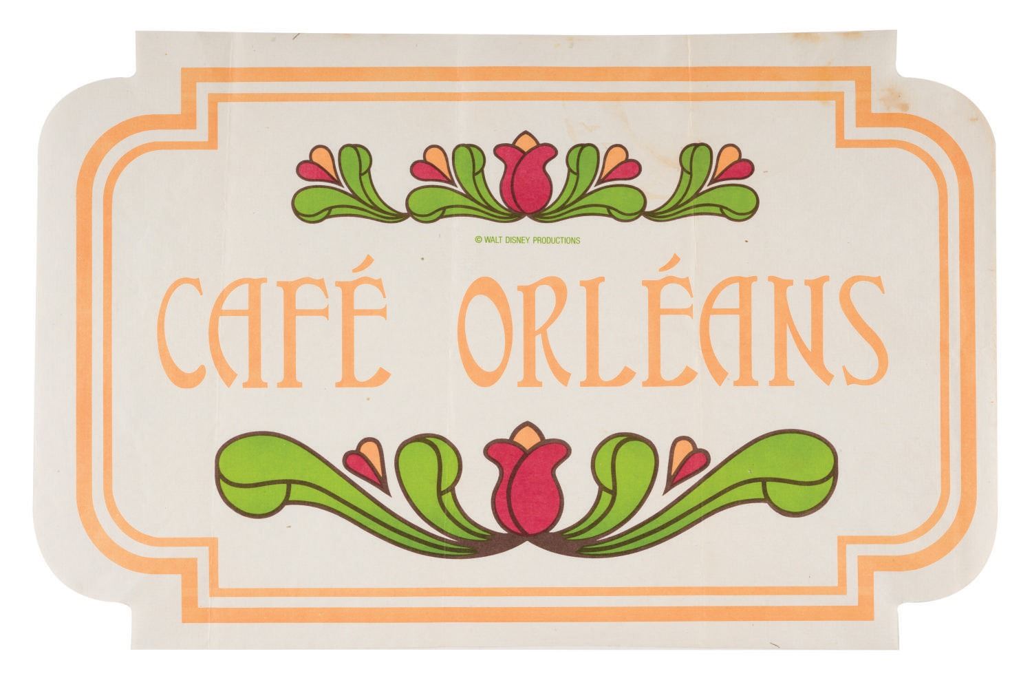(Disneyland, 1980s) A placemat from Café Orleans in New Orleans Square at Disneyland. The Creole Cafe was replaced by Cafe Orleans in 1972. This menu features a tri-color logo of the table service restaurant used from 1972 until recent years. Measuring 14"x8.75", the paper placemat is in good condition with few creases, spots of discoloration, and wear throughout from Park use, handling, and age.