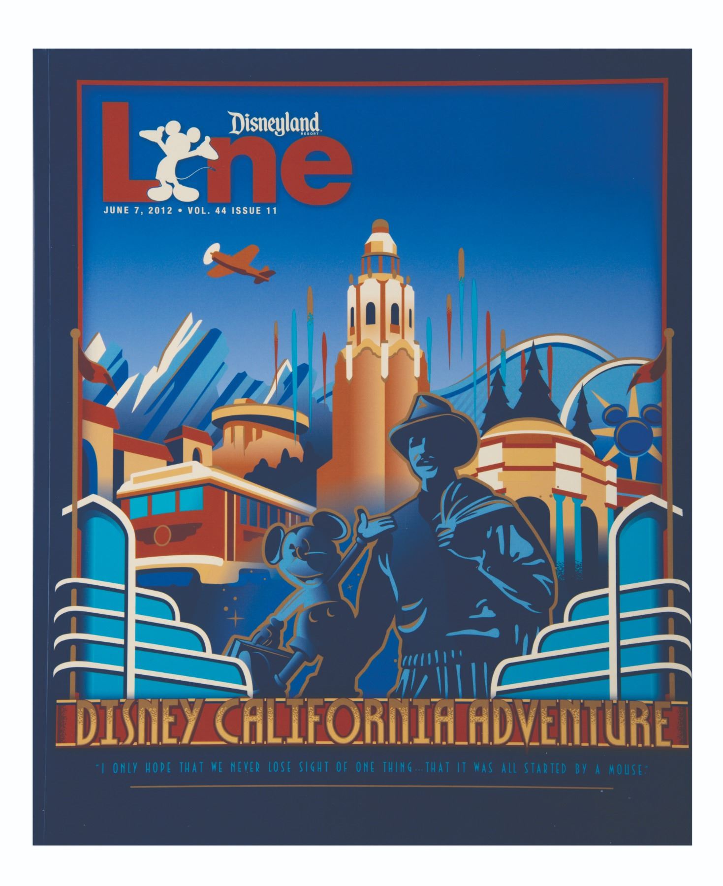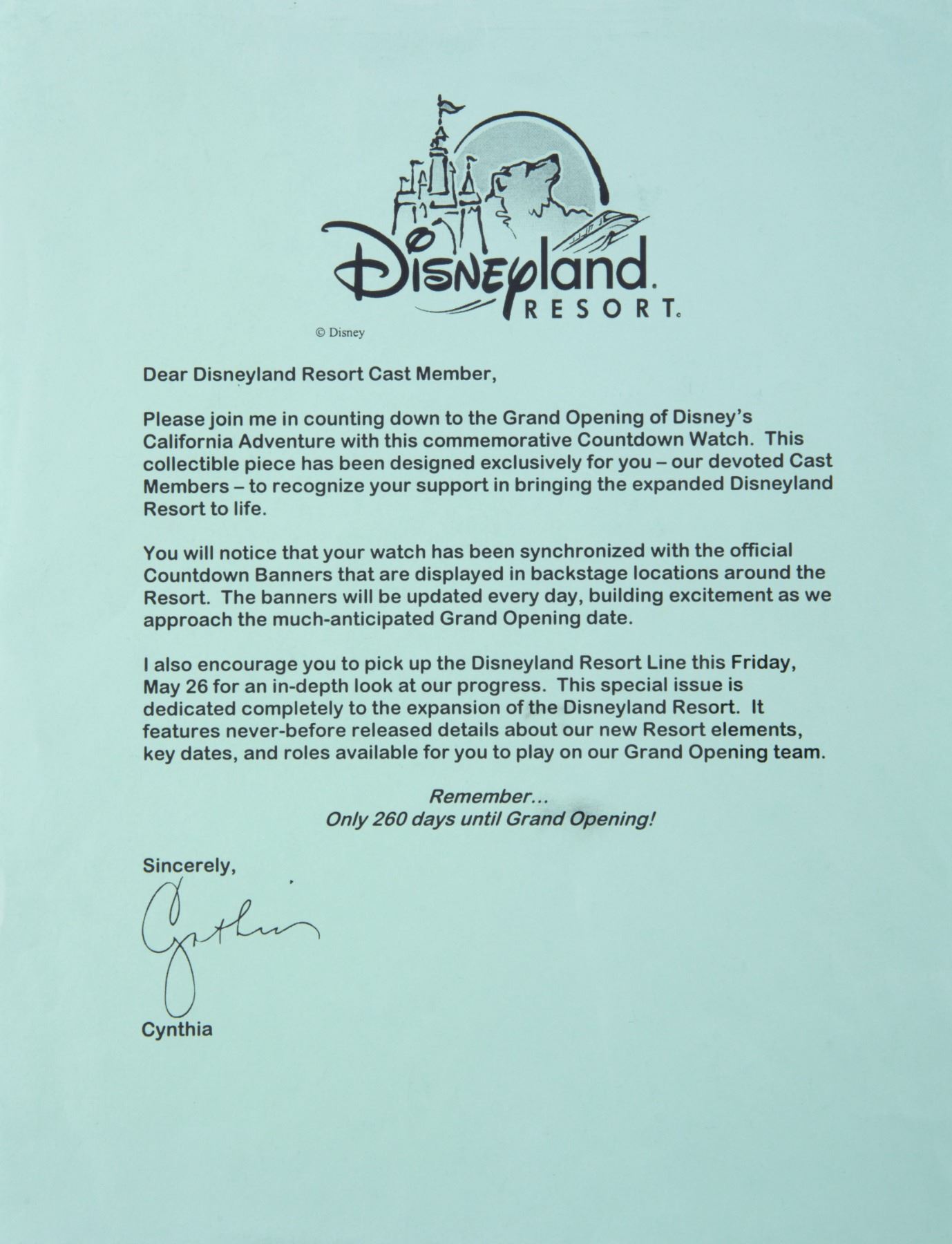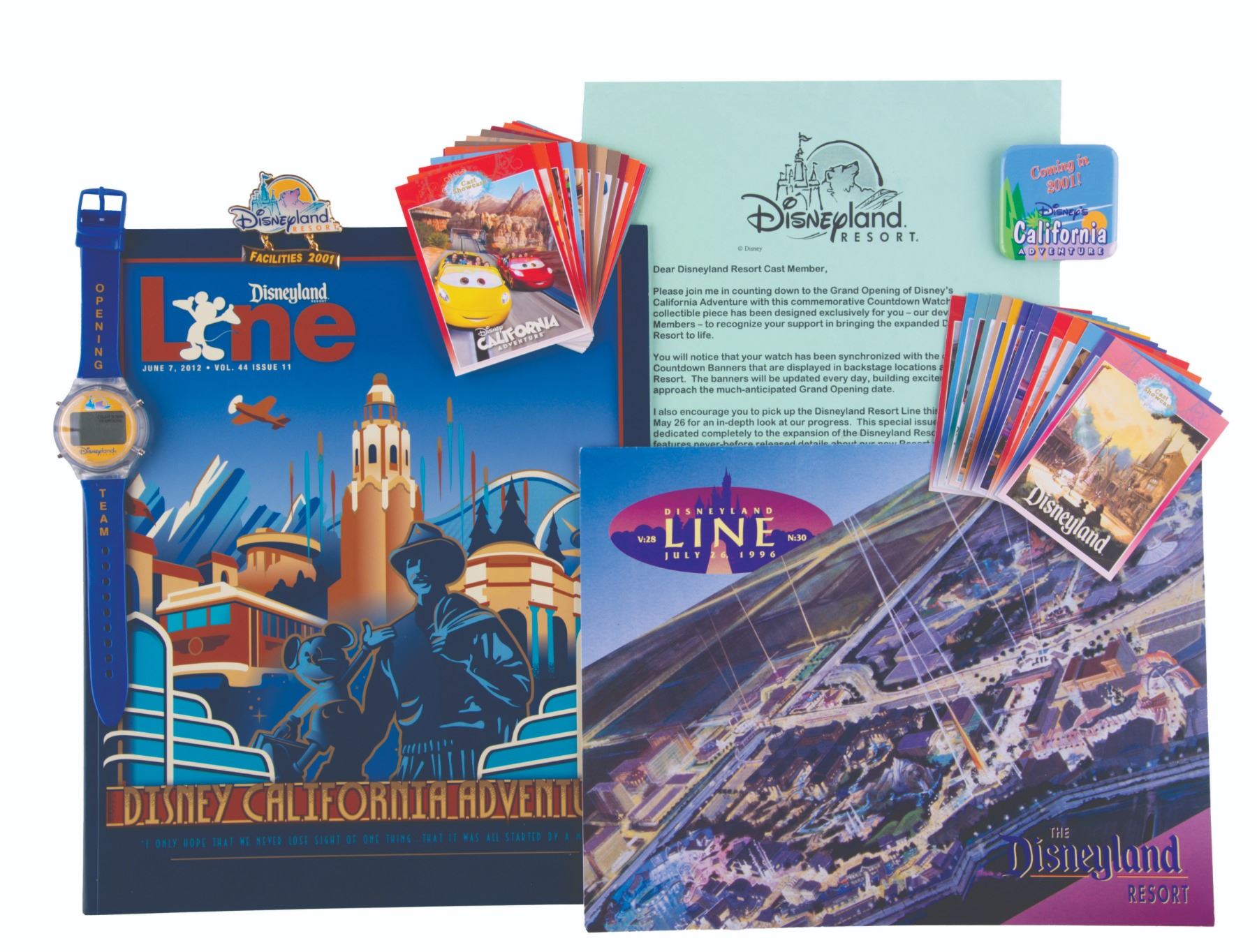 (California Adventure, 1996-2012) A collection of rare California Adventure pre-opening memorabilia given exculsively to Cast Members. The collection includes an extremly rare commemorative "Countdown Watch" with letter, a 1996 special edition of the Disney Line oulining the plans for the park, a "comimg in 2001" button, a 2001 Disneyland Resort pin, a 2012 Disneyland Line Magazine about California Adventure, and a set of 2012 cast showcase fact cards. All pieces are in very good condition with minor wear.
