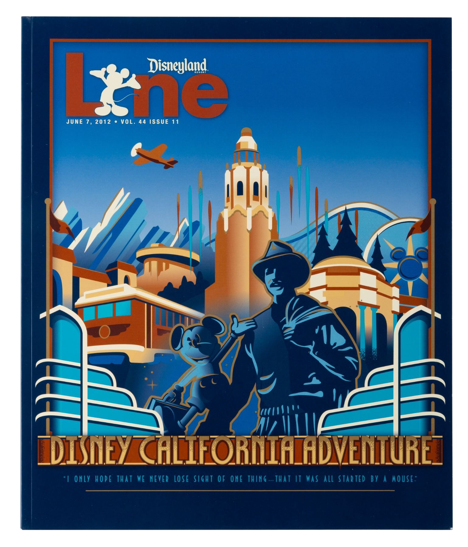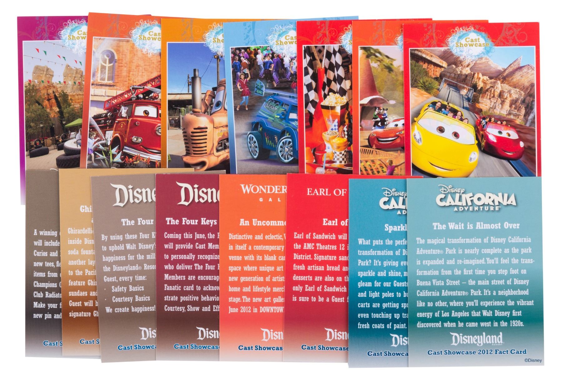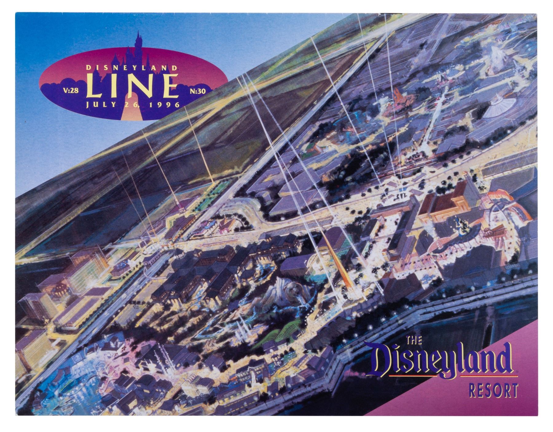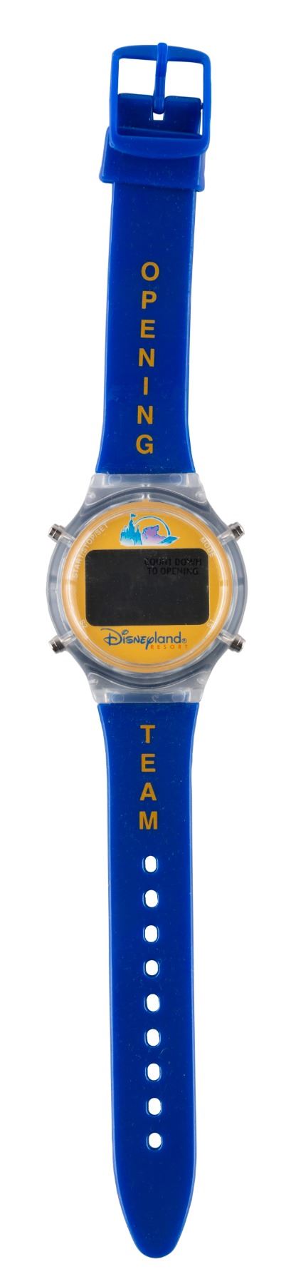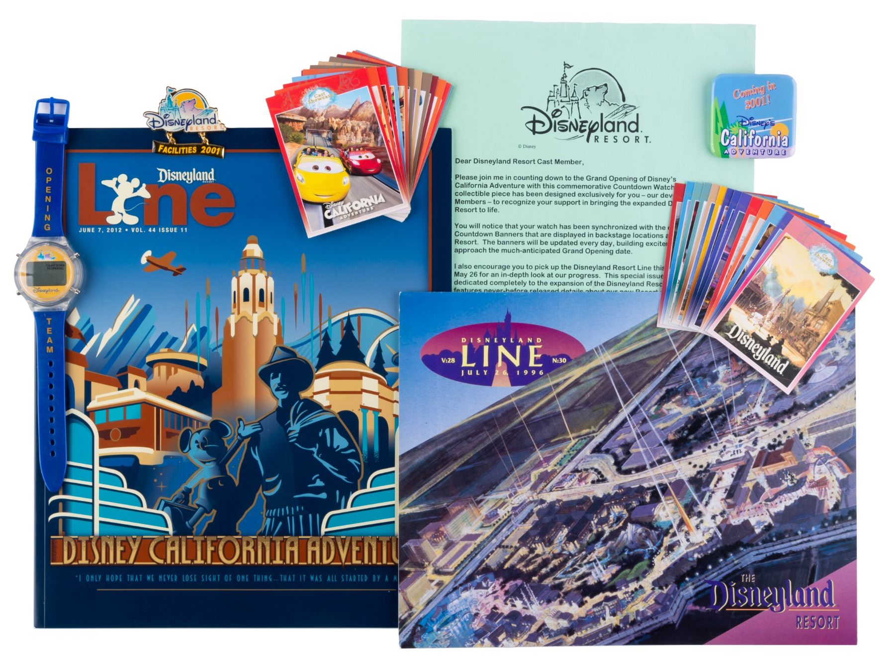 (California Adventure, 1996-2012) A collection of rare California Adventure pre-opening memorabilia given exclusively to Cast Members. The collection includes an extremely rare commemorative "Countdown Watch" with a letter, a 1996 special edition of the "Disney Line" outlining the plans for the park, a "Coming in 2001" button, a 2001 Disneyland Resort pin, a 2012 Disneyland Line Magazine about California Adventure, and a set of 2012 cast showcase fact cards. All pieces are in very good condition with minor wear.Est. Opening Bid: $40.00