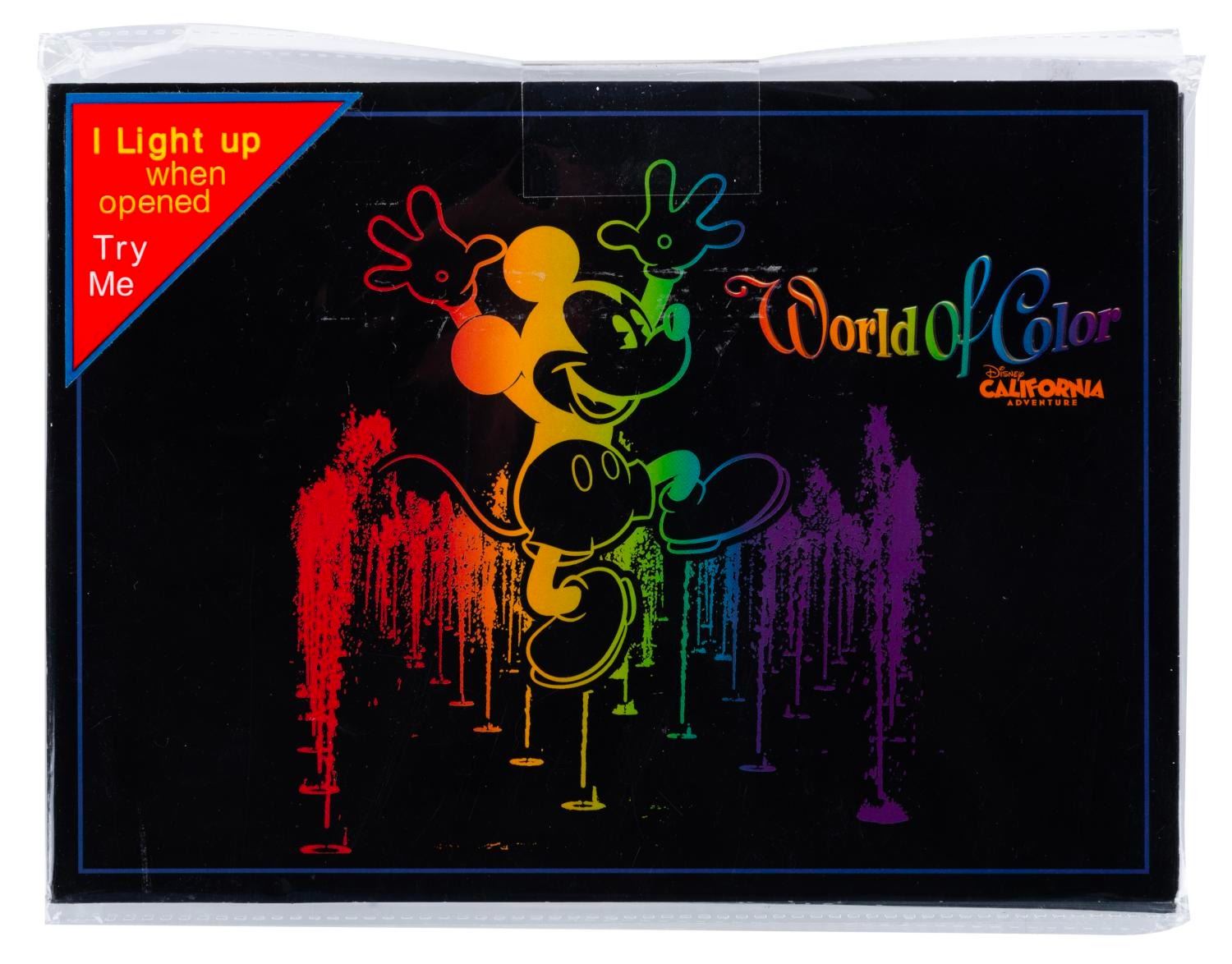 (Disney's California Adventure, 2010) A picture frame themed to the World of Color nighttime spectacular made to display a photo measuring from 3" x 5" up to 5" x 7". When opened, the inside image of Mickey's Fun Wheel lights up and flashes. Measuring 7" x 9.75", the cardboard frame is in very good working condition with very light handling wear.