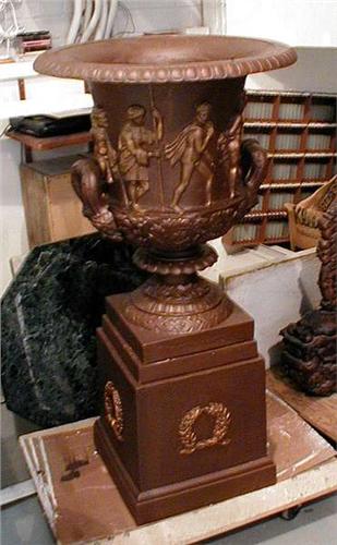 A Campagna form cast iron urn with matching pedestal base. Relief decorated with gilt highlighted Grecian figures. With scroll form handles. On matching pyramidal base. Top 23" diameter, 44" high. 4000-5000
