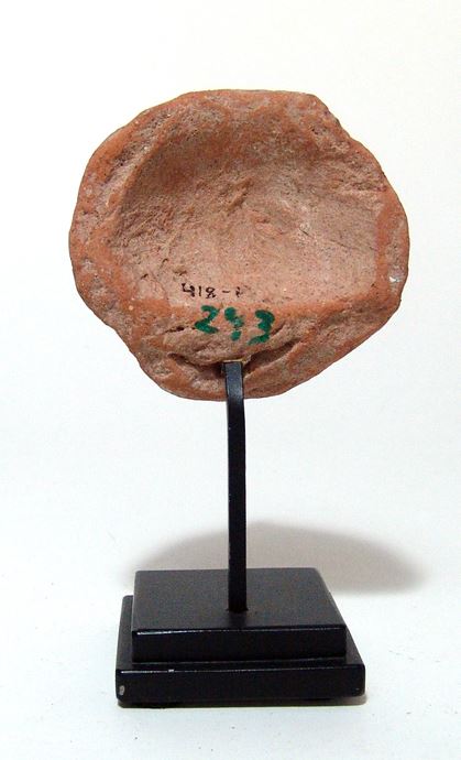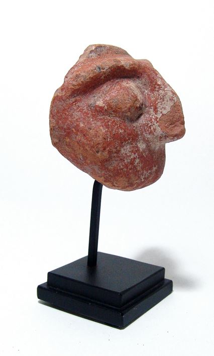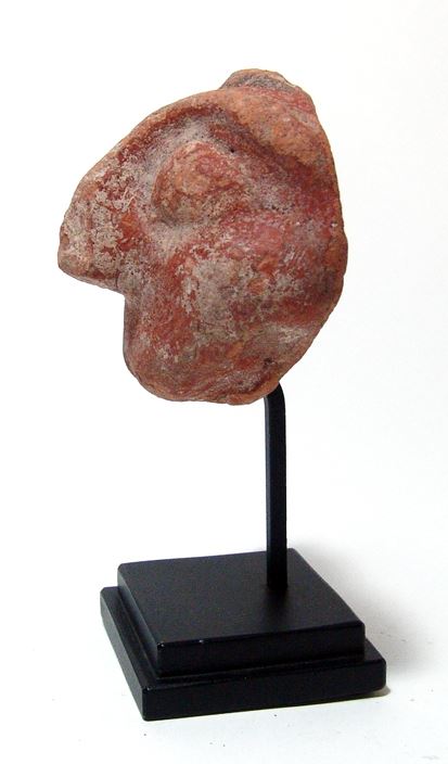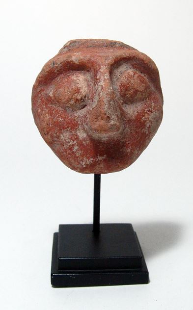 A Canaanite ceramic face of a deity, Israel, Jaffa, c. 1200 BC, with large angular nose, large deep-set eyes and narrow mouth, the backside concave with flat border. A nice example with well-preserved red-slip and attractive deposits. Old collection numbers on the backside. Custom stand. Ex Archaeology Center, Tel-Aviv.