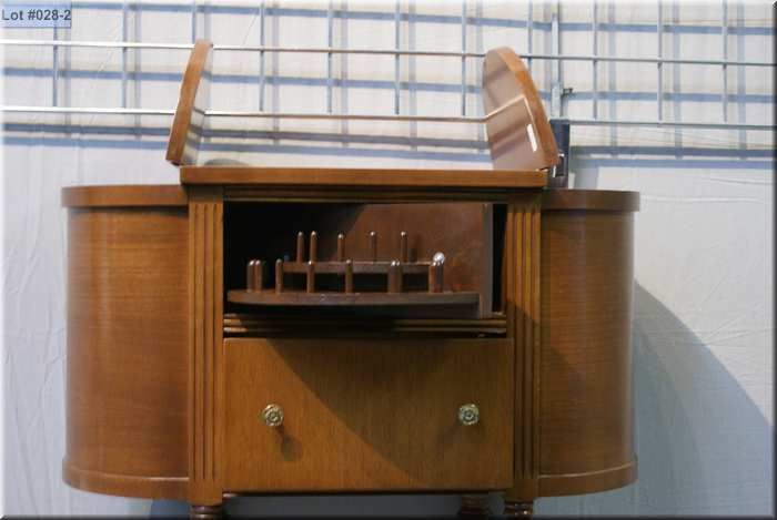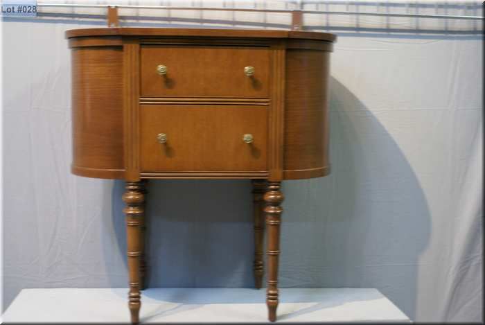 A Canadian made oval shaped floor standing sewing box with flip top wool storage, rotating spool holder and single drawer made by Knechtel Furniture Kitchener, Ontario