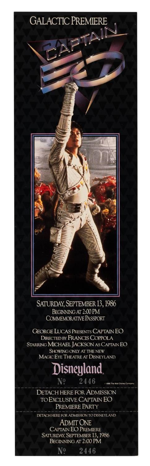 (Disneyland, 1986) A special commemorative passport created to celebrate the premiere and premiere party for Captain EO. This beautiful unused passport features an image of Michael Jackson and is ticket number 2446. Measuring 3.5" x 12.5", the passport is in fine condition.