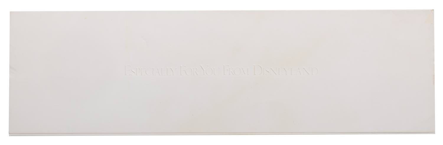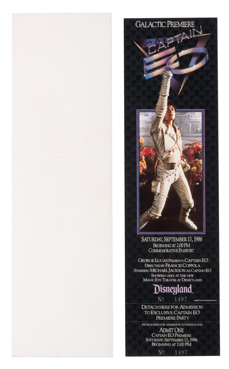 (Disneyland, 1986) A special commemorative passport for the premiere and party for Captain EO on Saturday, September 13, 1986. This beautiful, unused passport features an image of Michael Jackson and is ticket number 1497. Measuring 3.5" x 12.5", the passport is in fine condition. The original envelope is in very good condition with light handling wear.