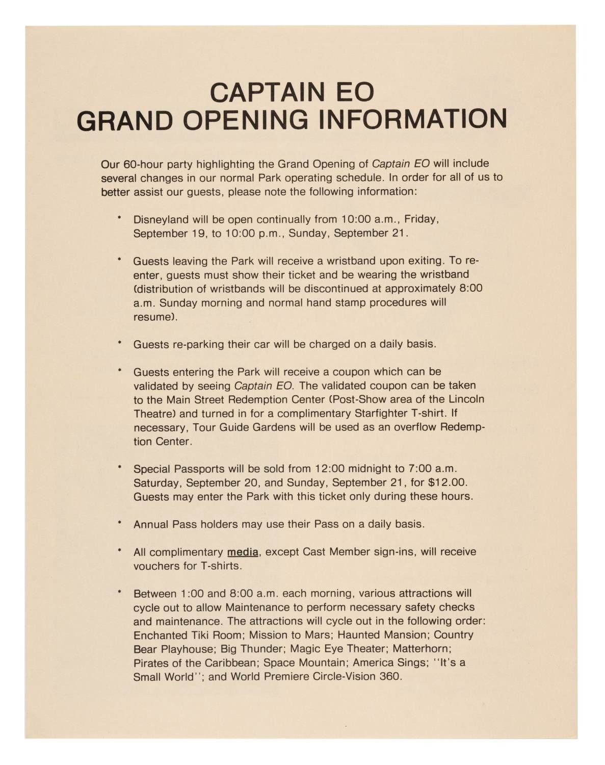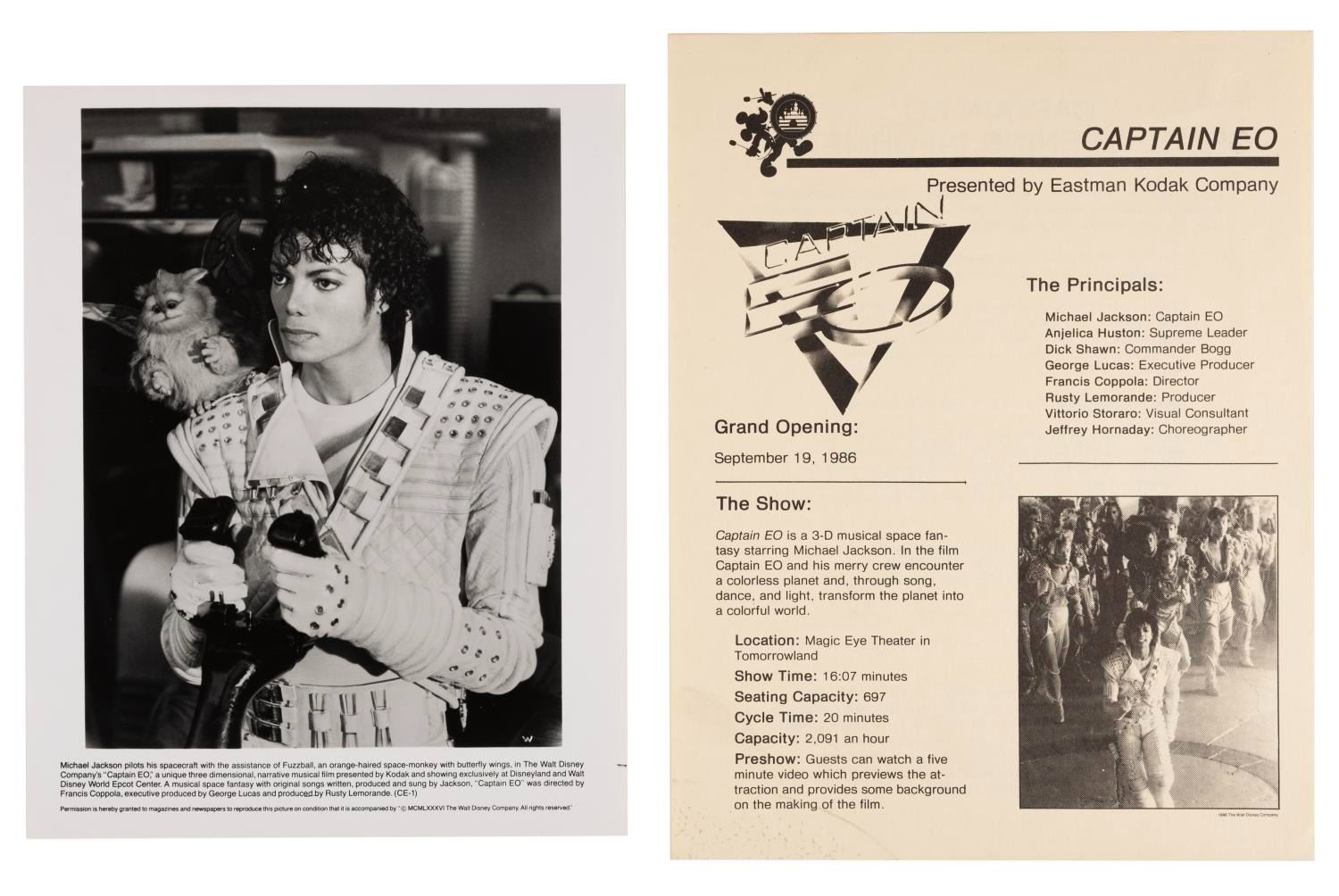 (Disneyland, 1986) A Captain EO Grand Opening media info sheet and publicity photo. Measuring 8" x 10", the info sheet is in good condition with yellowing from age and markings on the bottom left corner. The photo is 8" x 10" and in very good condition with some scratches and a stray black mark on the bottom right.
