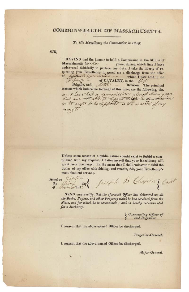 Partially Printed Document. One page, 8” x 11 5/8”. Upton, Massachusetts. November 3, 1813. The document is a request for a military discharge for Joseph B. Chapin, a captain in a Cavalry company in the first Brigade and sixth division. Chapin request this discharge because, “ … I have held a Commission almost seven years and am not able to support such a commission as it ought to be supported is the reason of my request …” Usual folds. Overall Very Fine.