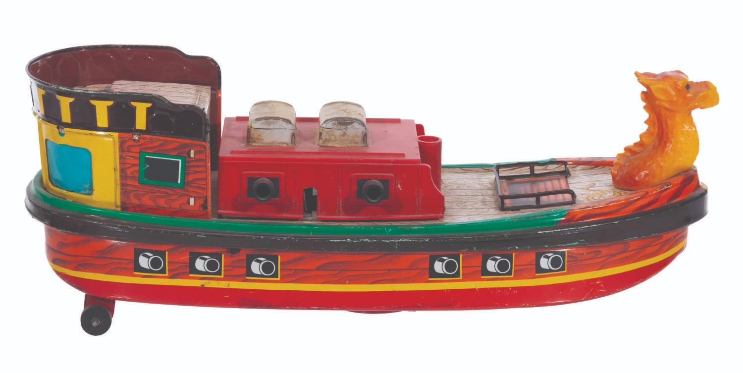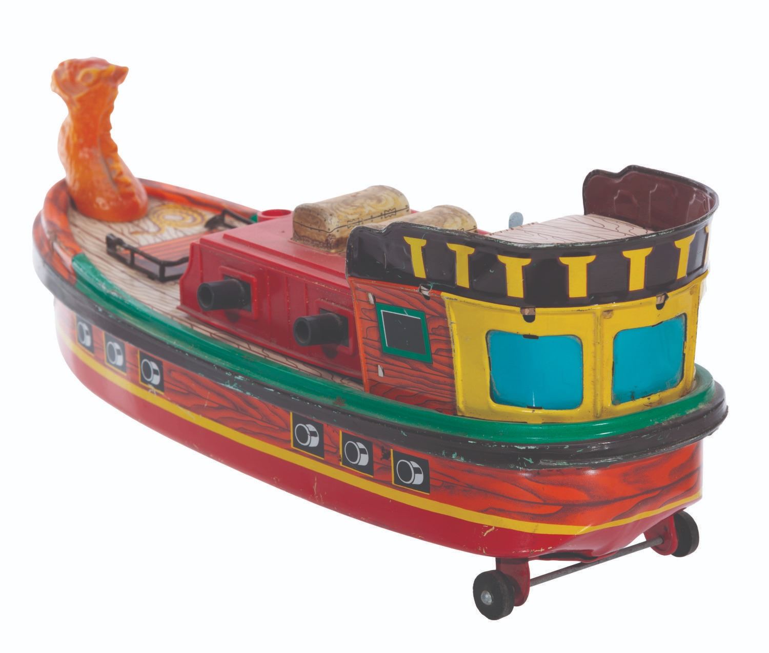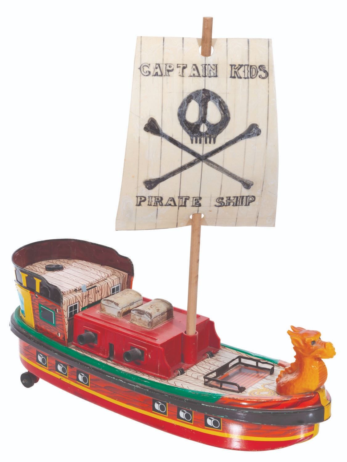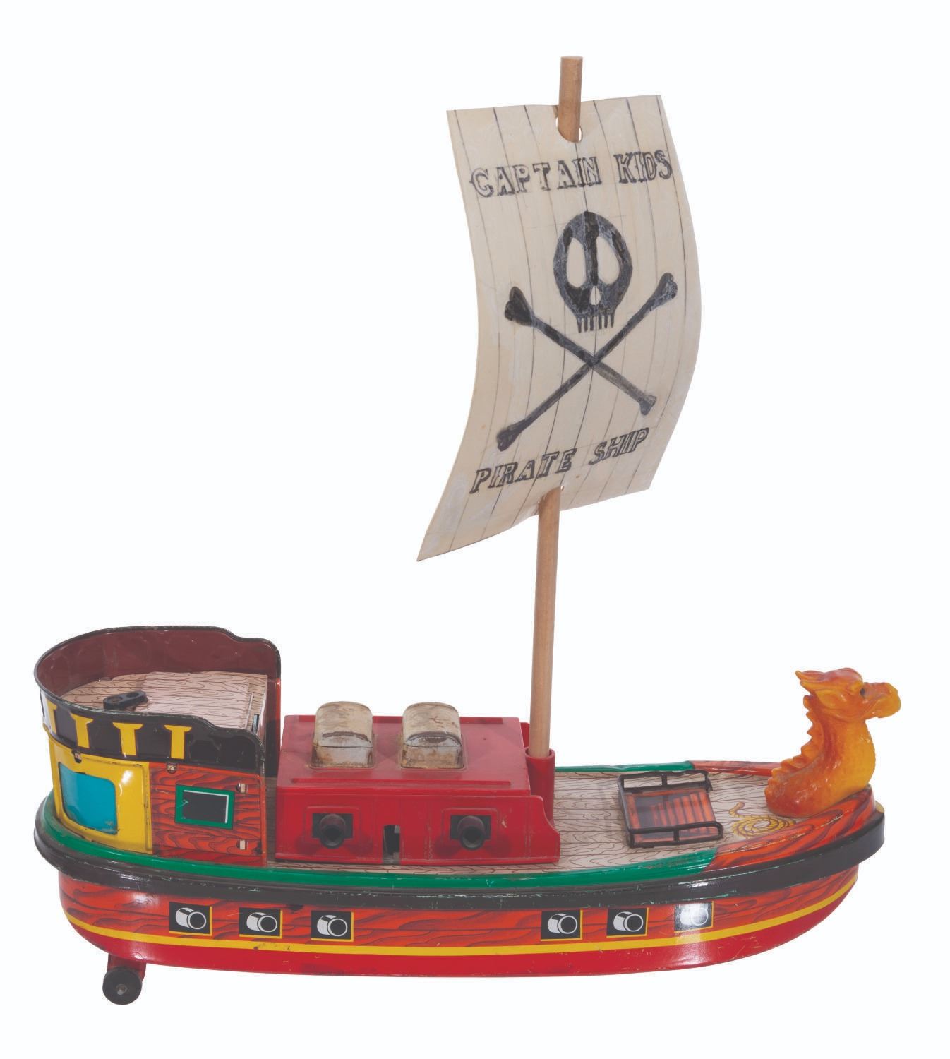 (Yonezawa, 1960s) A Captain Kidd pirate ship tin toy manufactured by Yonezawa of Japan. The ship features an orange dragon on the bow, cannons on the side, and a detachable mast with a hand-made reproduction skull and crossbones sail. The ship, which requires two D batteries (not included), has been tested and does not work. Measuring 13" x 14", the ship displays in good condition with scratches, scuffs, paint touch-ups, a sticker on the back of the sail, and wear from use.