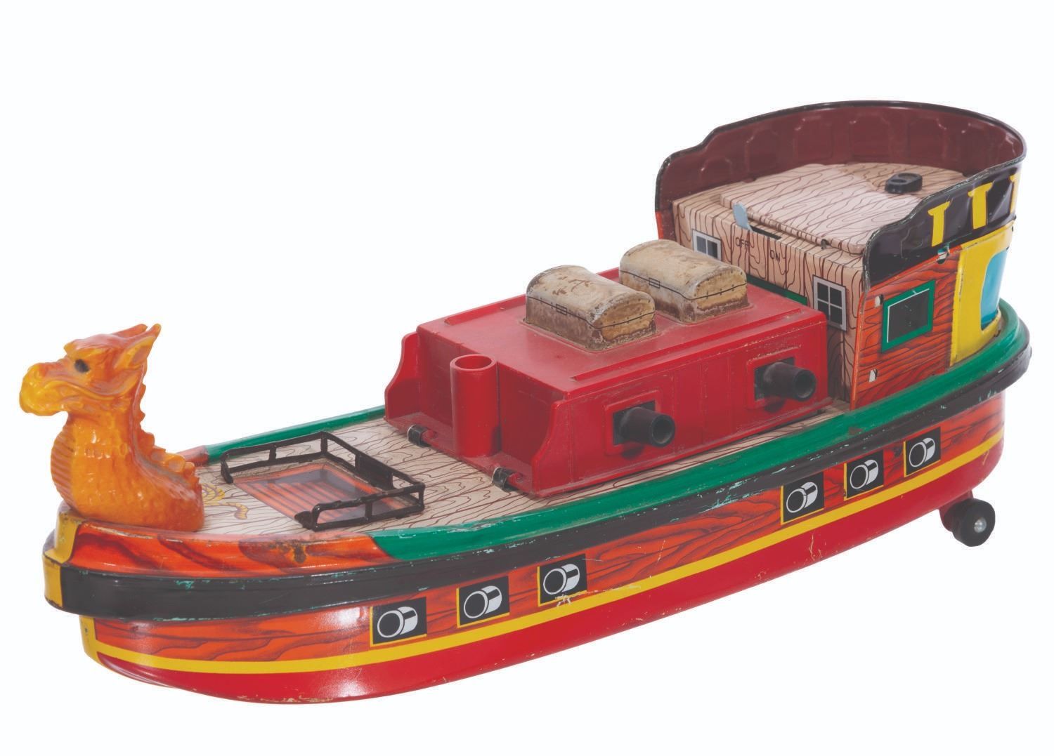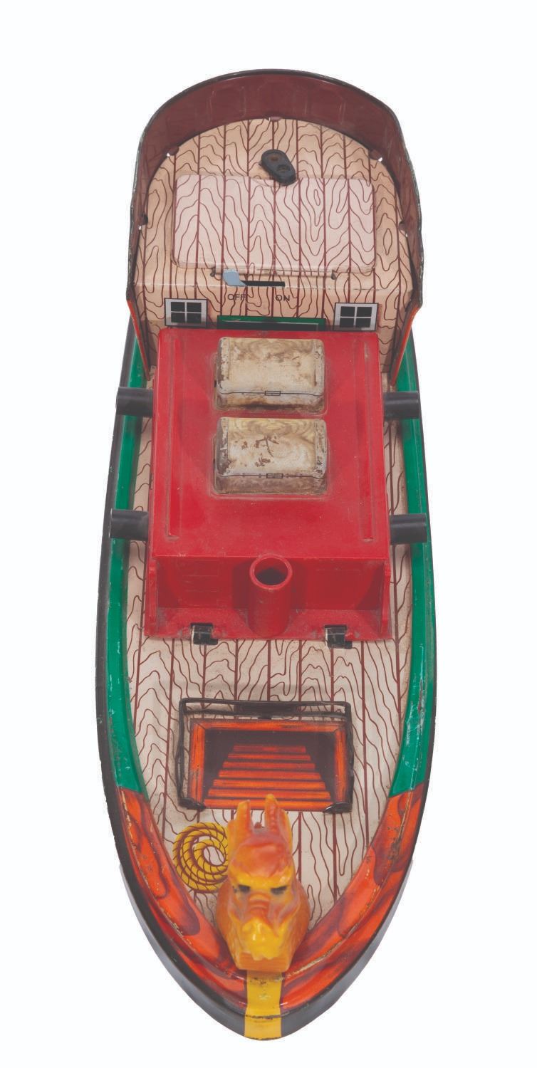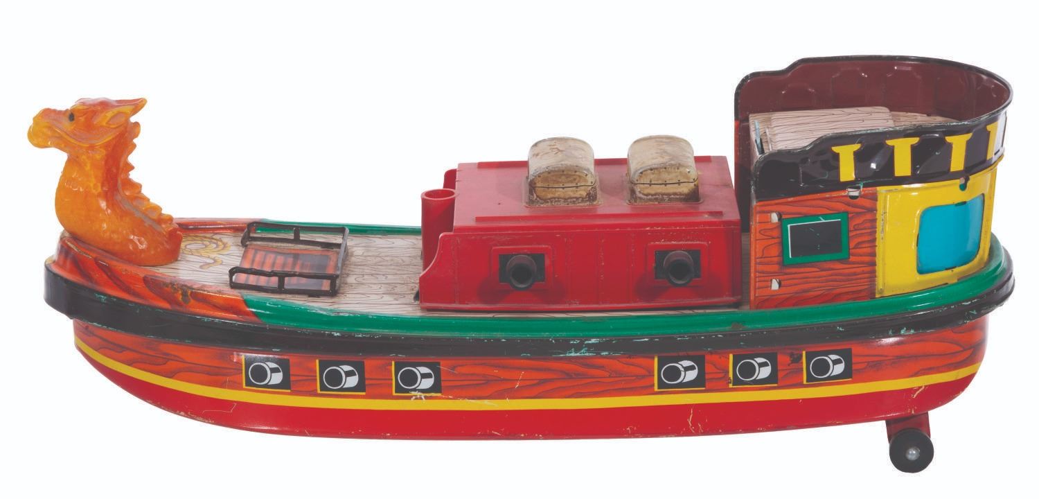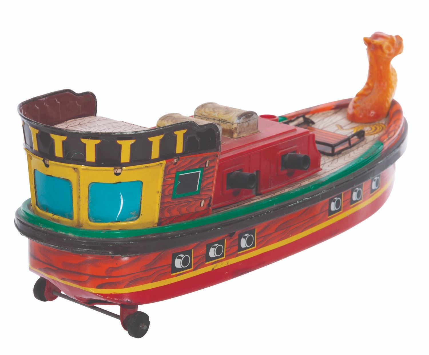 (Yonezawa, 1960s) A Captain Kidd pirate ship tin toy manufactured by Yonezawa of Japan. The ship features an orange dragon on the bow, cannons on the side, and a detachable mast with a hand-made reproduction skull and crossbones sail. The ship, which requires two D batteries (not included), has been tested and does not work. Measuring 13" x 14", the ship displays in good condition with scratches, scuffs, paint touch-ups, a sticker on the back of the sail, and wear from use.
