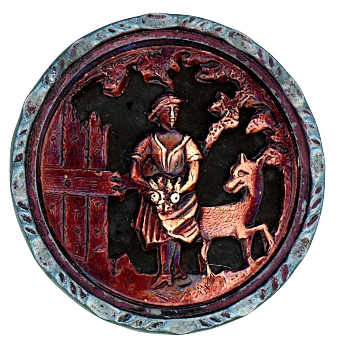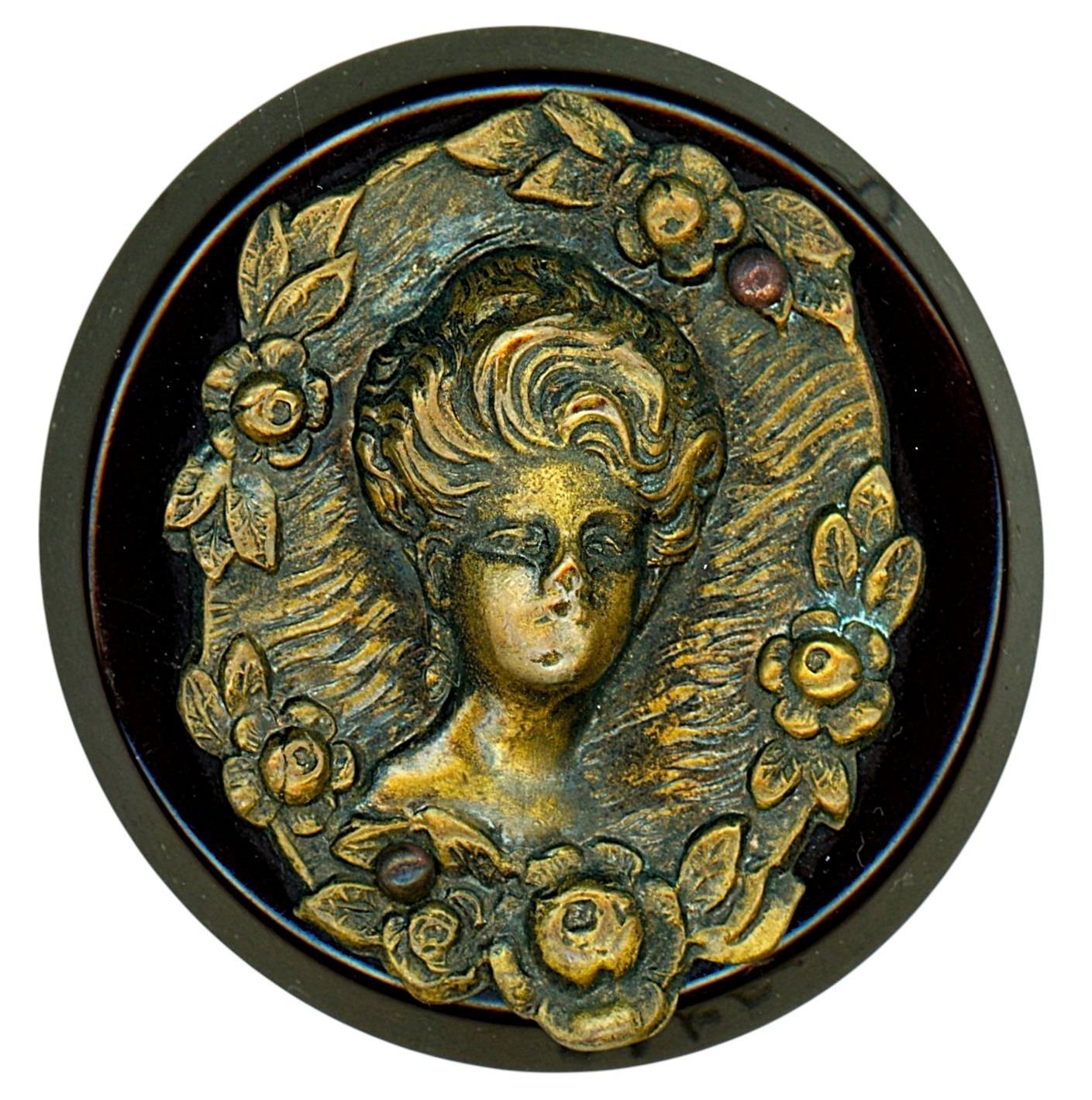 12 Large 19th and 20th century assorted material examples. This card includes a very nice example of the Ivoroid (early celluloid) button known as Flora and the Hind, but the red tint in this example is very scarce to find. The lot also includes a nice Acrylic shot, several assorted metal pictorials, a Bakelite and brass example, a litho and more.