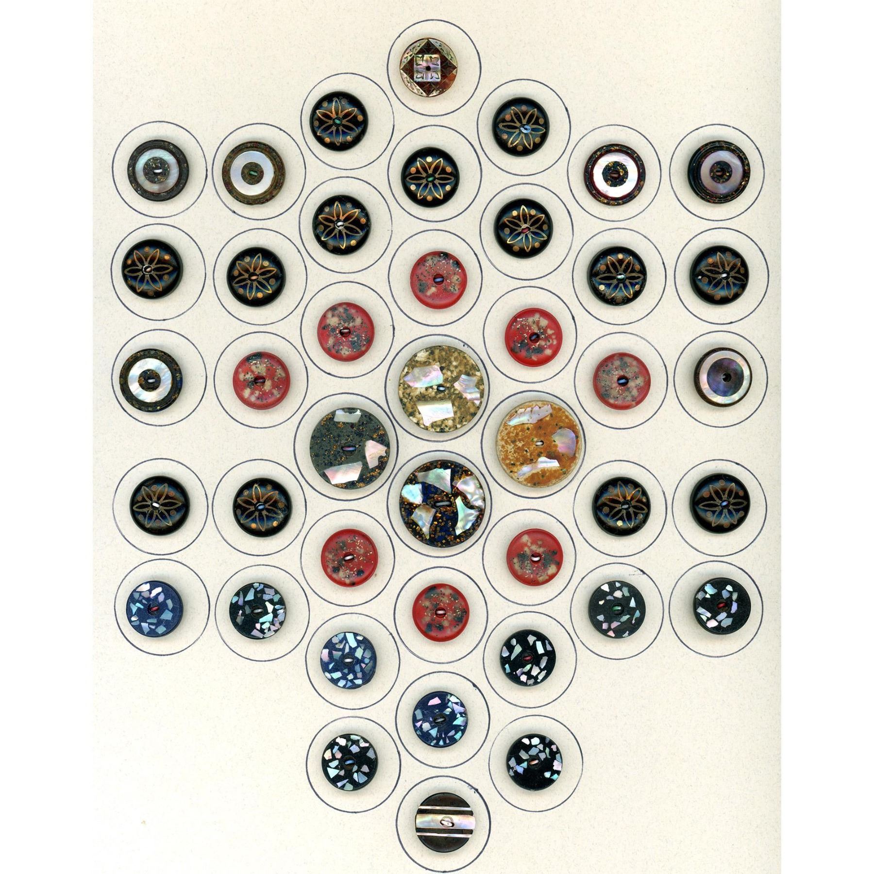 42 Small/Medium 19th century assorted technique examples. This card includes several sets of inlays in compo along with a nice set of (13) gold Pique work on horn/tortoise. Nice card.