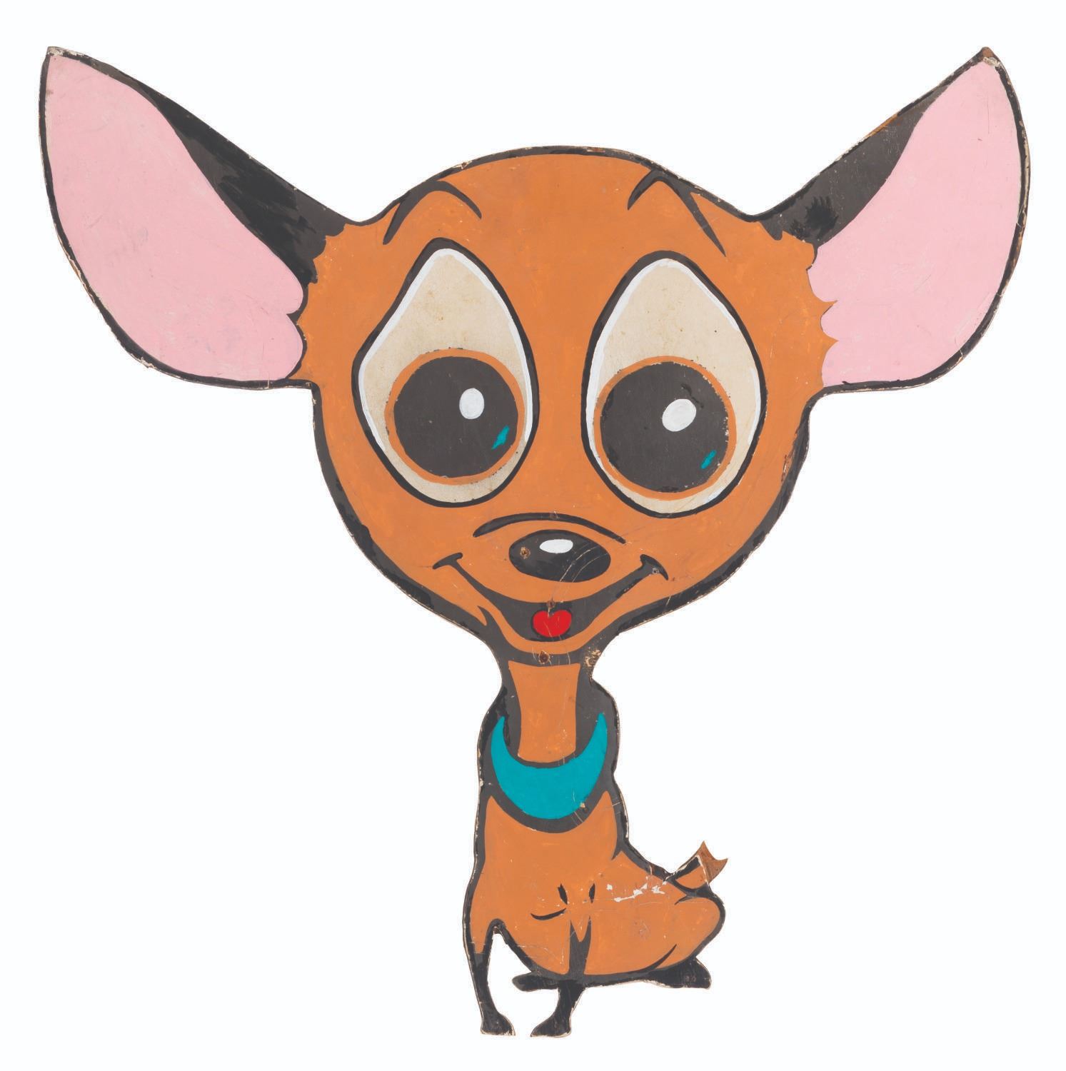 (Clampett, 1960s) A handmade wooden cut-out of Careless the Mexican Hareless from “Beany and Cecil” that decorated Bob Clampett’s backyard pool area. Measuring 21.75” x 22.5” and 0.25” thick, the display is in fair condition with edge wear, broken tail, peeling, scratches, cracks, soiling, and discoloration. Due to size and weight, this item requires special shipping arrangements. Please inquire before bidding.