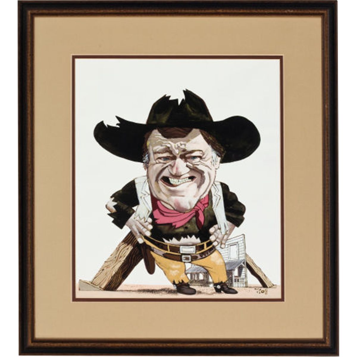 A Caricature, 1970s. Gouache on paper, depicting Wayne being propped up by a wooden stand just like the building behind him, signed in the lower right corner "Trog;" included is a reprinted color image showing this piece in situ in Wayne's Newport Beach office.Matted and Framed: 20" x 18"; Work Only: 14" x 12"