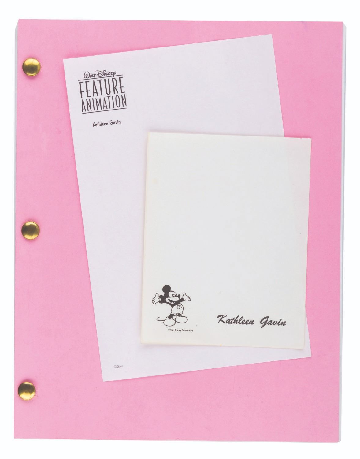 (Pixar, 2002-06) A first draft script for "Cars” dated April 12, 2002, and written by John Lasseter, Joe Ranft, and Jorgen Klubien. At this stage of development, the hero who we know as Lightning McQueen is called "Monte Carlo." The script is watermarked for Kathleen Gavin and includes two Studio stationery pages from her desk. Measuring 8.5” x 11”, the 168-page script is in very good condition with light handling wear, while the cover exhibits light creases, an ink inscription on the front, stains on the back, and wear from production use.