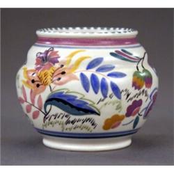A Carter, Stabler & Adams Poole Pottery ovoid vase, designed by Truda Carter, and painted with stylised flowers and foliage in tones of pink, purple, blue and yellow on a matt white glazed ground, 3in high, impressed mark, incised shape no. 208, c.1940