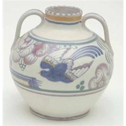 A Carter, Stabler & Adams Poole vase, 2-handled and painted with wild birds and stylised foliage in polychrome, impressed mark, circa 1925, 7ins £100-150