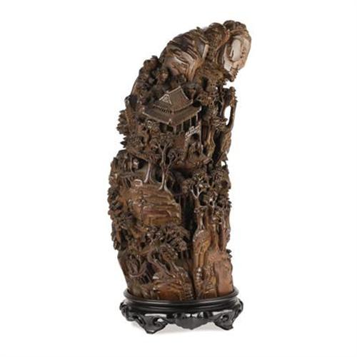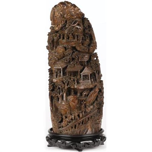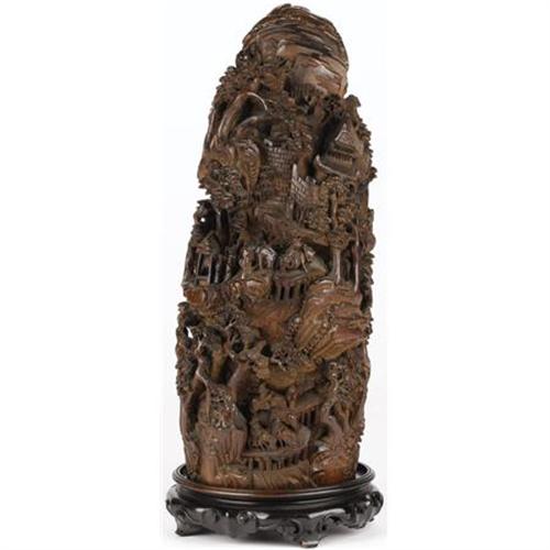 <B>A Carved Bamboo Relief<BR></B></I>Unknown maker<BR>Circa 1900<BR>The bamboo <I>Mountain,</B></I> deeply carved relief scenes of travelers crossing a bridge to a village with houses and stables progressing to the mountain top<BR>Unmarked<BR>15 inches high x 6 inches wide<BR><BR><b>Shipping:</b> Requires 3rd Party Shipping (<a target="_blank" href="http://www.heritageauctions.com/common/shipping.php">view shipping information</a>)