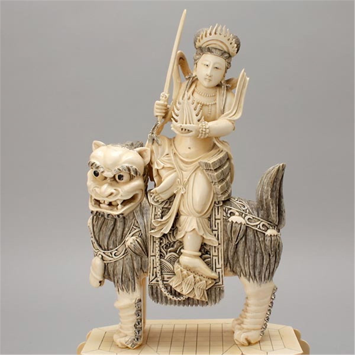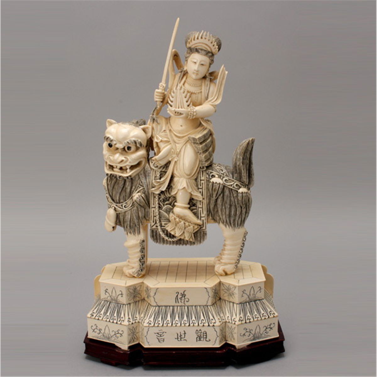 A Carved Ivory Figure Riding a Beast*, The Buddhist figure holding a flame and a sword, sitting in 'royal ease' next to a stack of books on the back of a playful lion, attached to a stepped plinth covered with ivory tiles, the surfaces tinted in black wash, with wood stand. Height: 16 inches (40.6 cm) [Minor losses, chips, age cracks. This condition report states major condition issues only.]